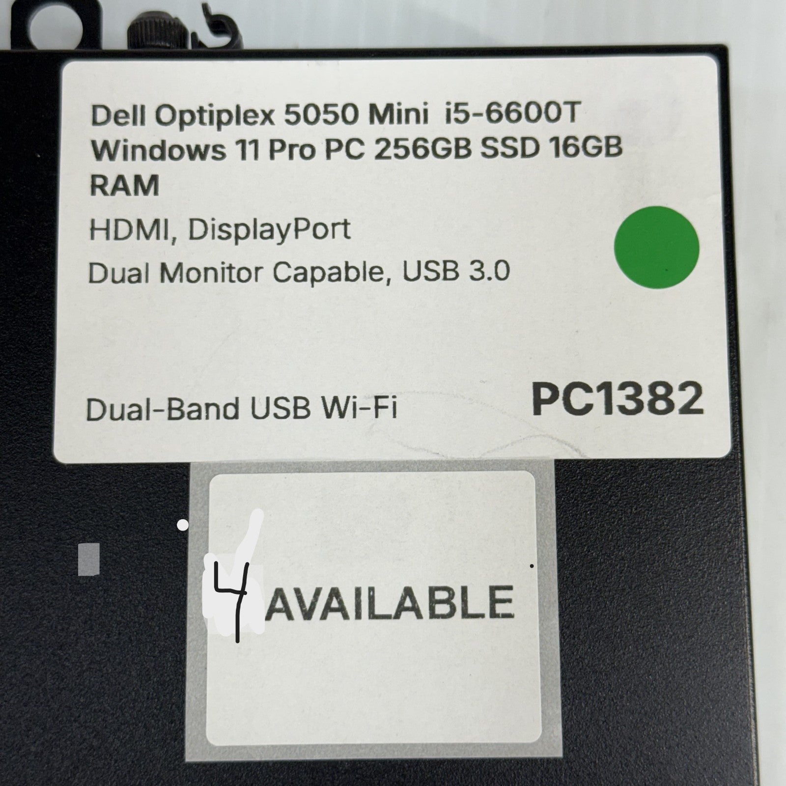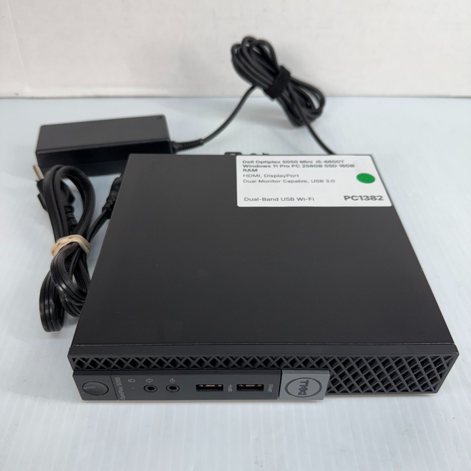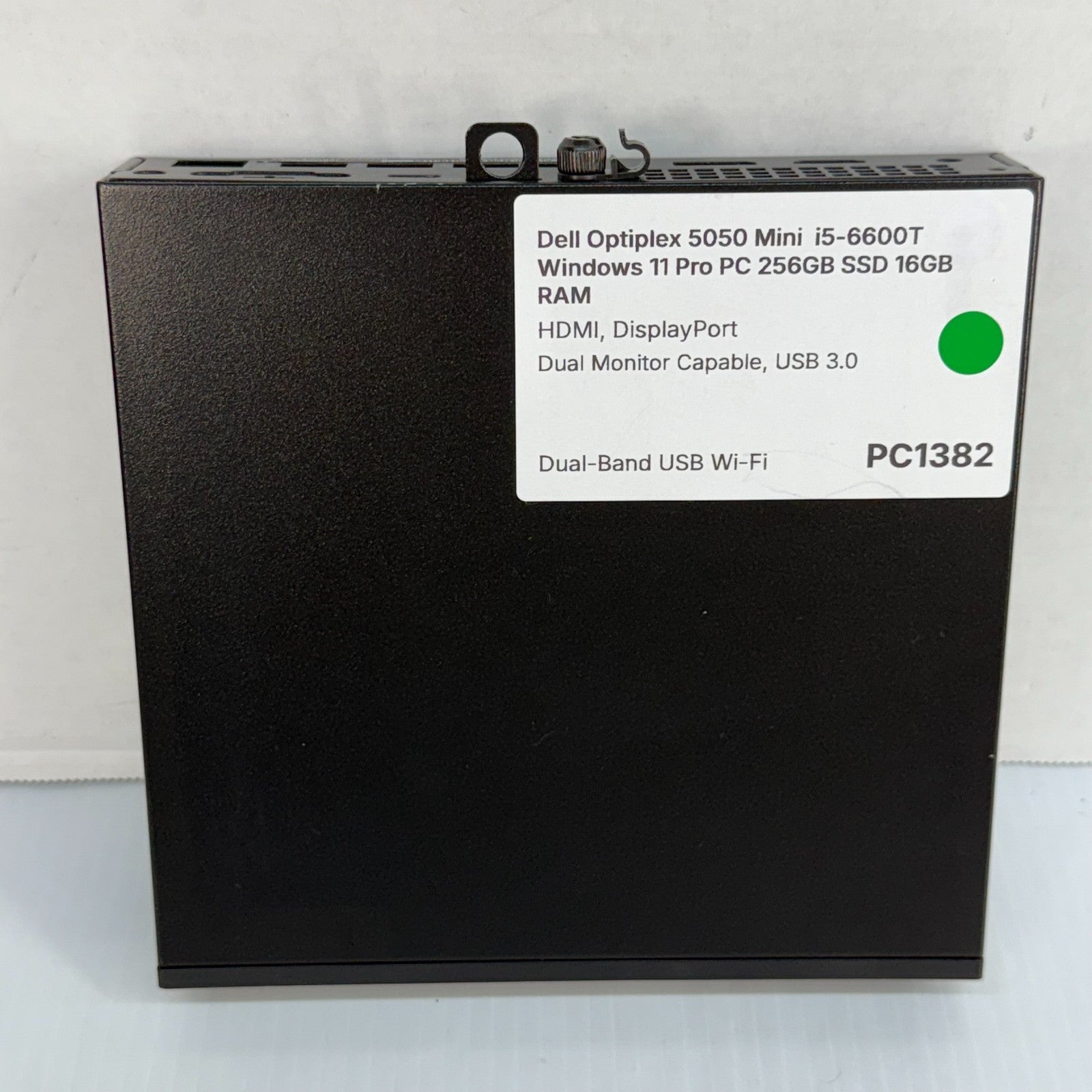 This nice Mini PC measures only 6.9 x 1.3 x 7.0 inches! Fast Dual-Band, USB Wireless (Wi-Fi) Adapter Included! Dell Optiplex 5050 Intel Core i5-6600T 2.70-3.50GHz CPU 256GB SSD 16GB RAM DDR4 Video Outputs: HDMI, DisplayPort No Built-in DVD Drive Gigabit Ethernet, Audio Jack, & Dual Monitor Capable, USB 3.0