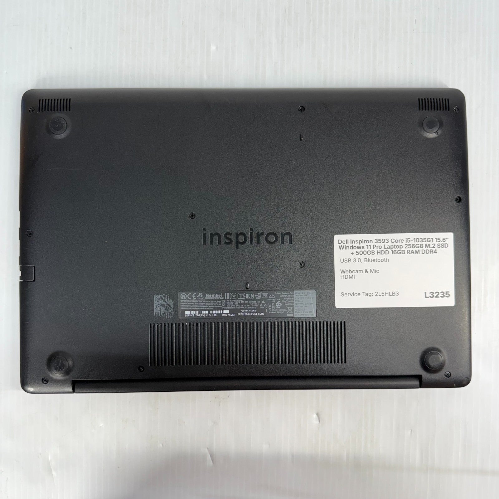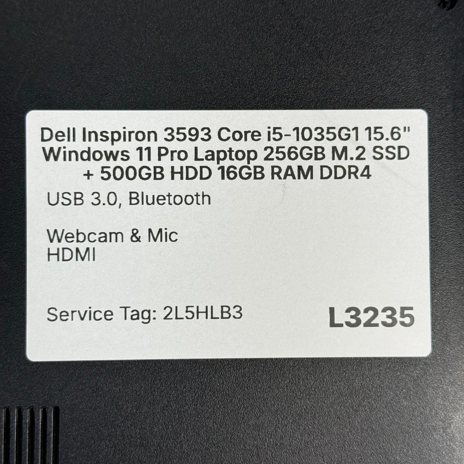 Service Tag: 2L5HLB3 4 Cores, 8 Threads on the CPU *Screen has tiny feint scratches on top, left corner (barely visible). Dell Inspiron 3593 Charger is Included. Windows 11 Pro 15.6 in. Display 256GB M.2 SSD + 500GB HDD Intel Core i5-1035G1 1.00-3.60GHz CPU 16GB RAM DDR4 Video Outputs: HDMI Built-in Webcam Other Features: USB 3.0, Bluetooth, SD Card Reader, & Built-in Speakers Dual Band Wi-Fi This model does not have a built in DVD Drive